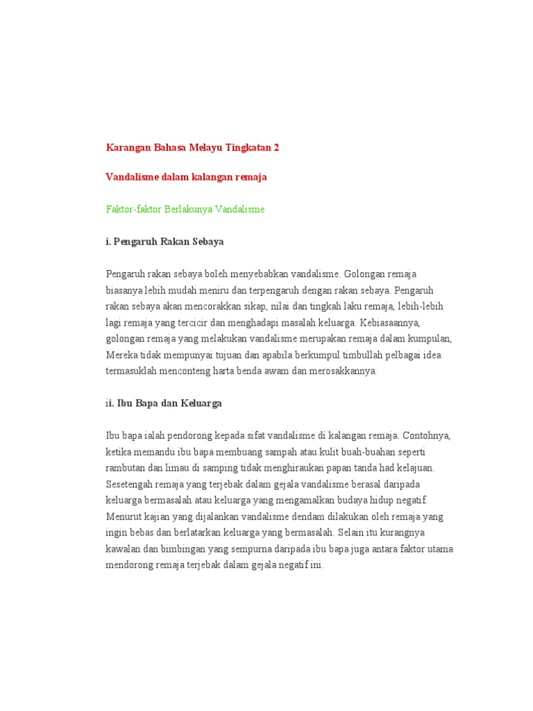 Karangan Bahasa Melayu Tingkatan 2 Vandalisme dalam kalangan remaja Faktor-faktor Berlakunya Vandalisme i. 11 Contoh Karangan Upsr Terbaik Bahasa Melayu Malay Language Phobia Words Language Worksheets. Pengaruh Rakan Sebaya Pengaruh rakan sebaya boleh menyebabkan vandalisme.